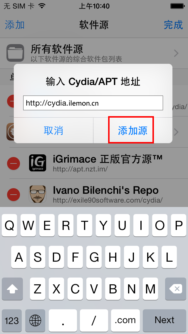 4.在弹出的框中输入http://cydia.ilemon.cn后,点击[添加源]